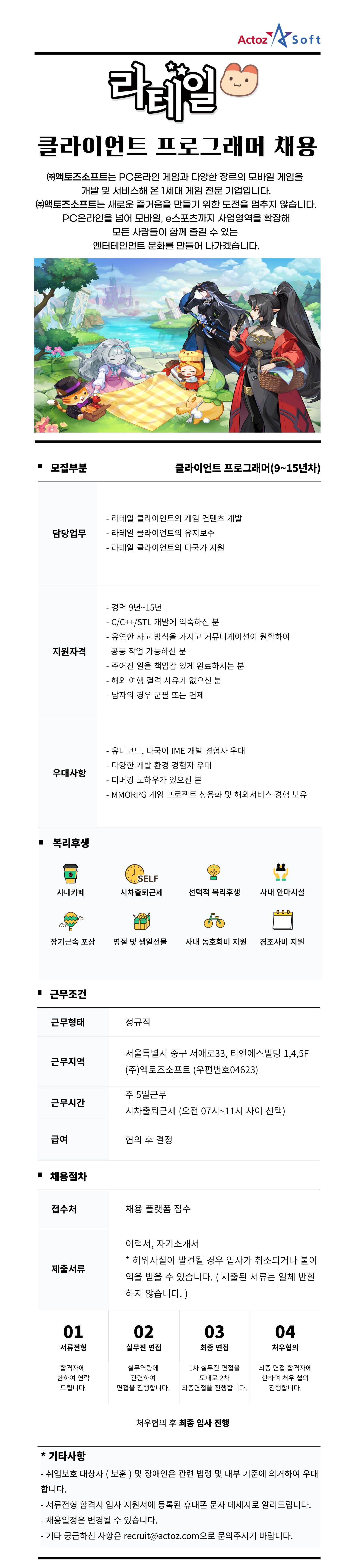 3.채용서류 반환 청구를 하려는 구직자는 채용서류 반환청구서[채용절차의 공정화에 관한 법률 시행규칙 별지 제3호 서식]를 작성하여 당사로 팩스(02-732-8623) 또는 이메일(hr@actoz.com)로 제출하면, 제출이 확인된 날로부터 14일 이내에 지정한 주소지로 등기우편을 통하여 발송해 드립니다. 이 경우 등기우편요금은 수신자 부담으로 하게 되오니 유념하시기 바랍니다.