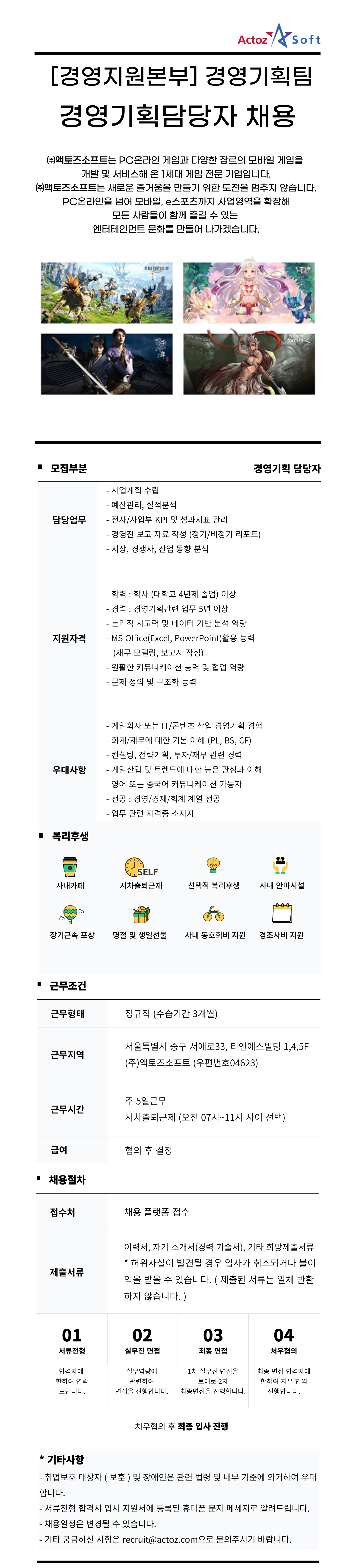 3.채용서류 반환 청구를 하려는 구직자는 채용서류 반환청구서[채용절차의 공정화에 관한 법률 시행규칙 별지 제3호 서식]를 작성하여 당사로 팩스(02-732-8623) 또는 이메일(hr@actoz.com)로 제출하면, 제출이 확인된 날로부터 14일 이내에 지정한 주소지로 등기우편을 통하여 발송해 드립니다. 이 경우 등기우편요금은 수신자 부담으로 하게 되오니 유념하시기 바랍니다.