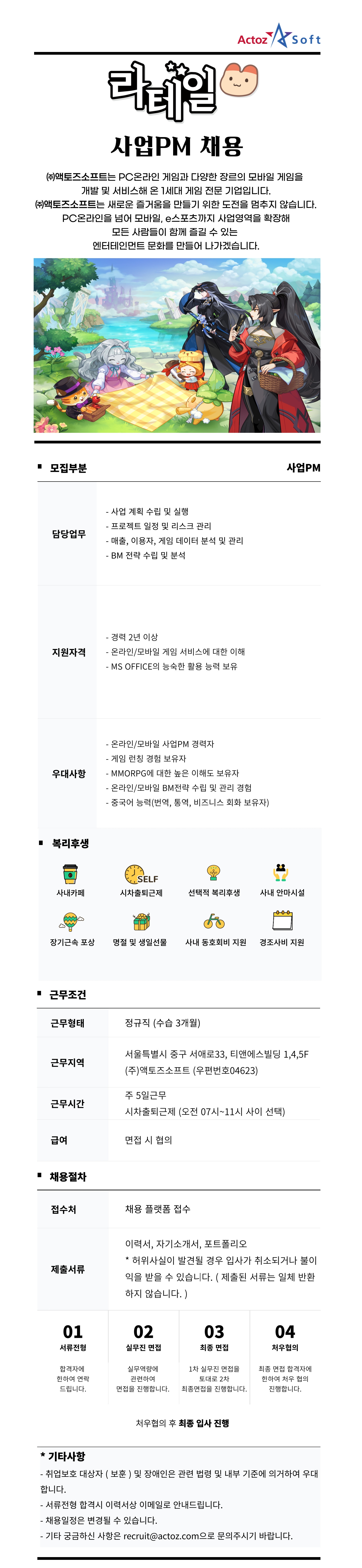 3.채용서류 반환 청구를 하려는 구직자는 채용서류 반환청구서[채용절차의 공정화에 관한 법률 시행규칙 별지 제3호 서식]를 작성하여 당사로 팩스(02-732-8623) 또는 이메일(hr@actoz.com)로 제출하면, 제출이 확인된 날로부터 14일 이내에 지정한 주소지로 등기우편을 통하여 발송해 드립니다. 이 경우 등기우편요금은 수신자 부담으로 하게 되오니 유념하시기 바랍니다.